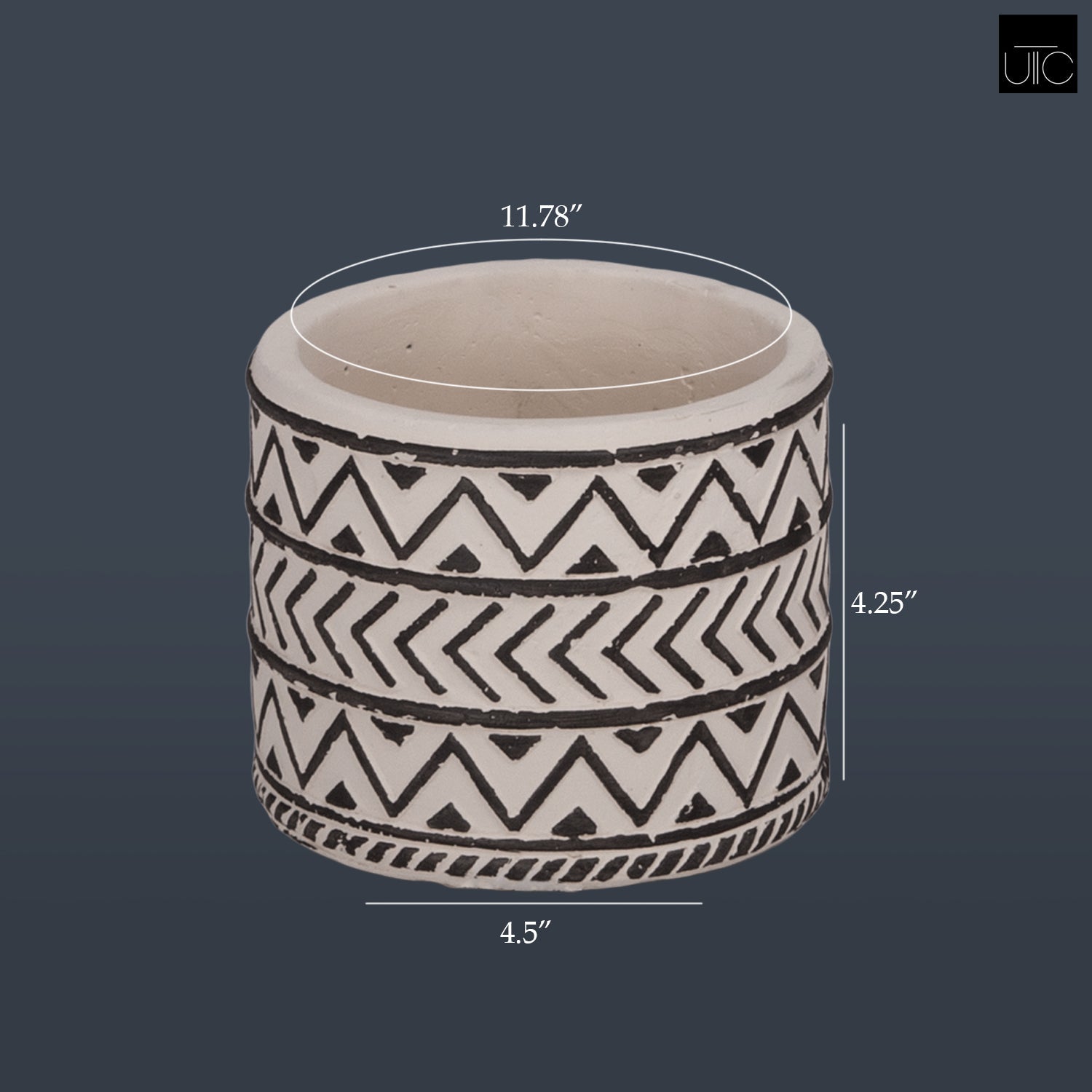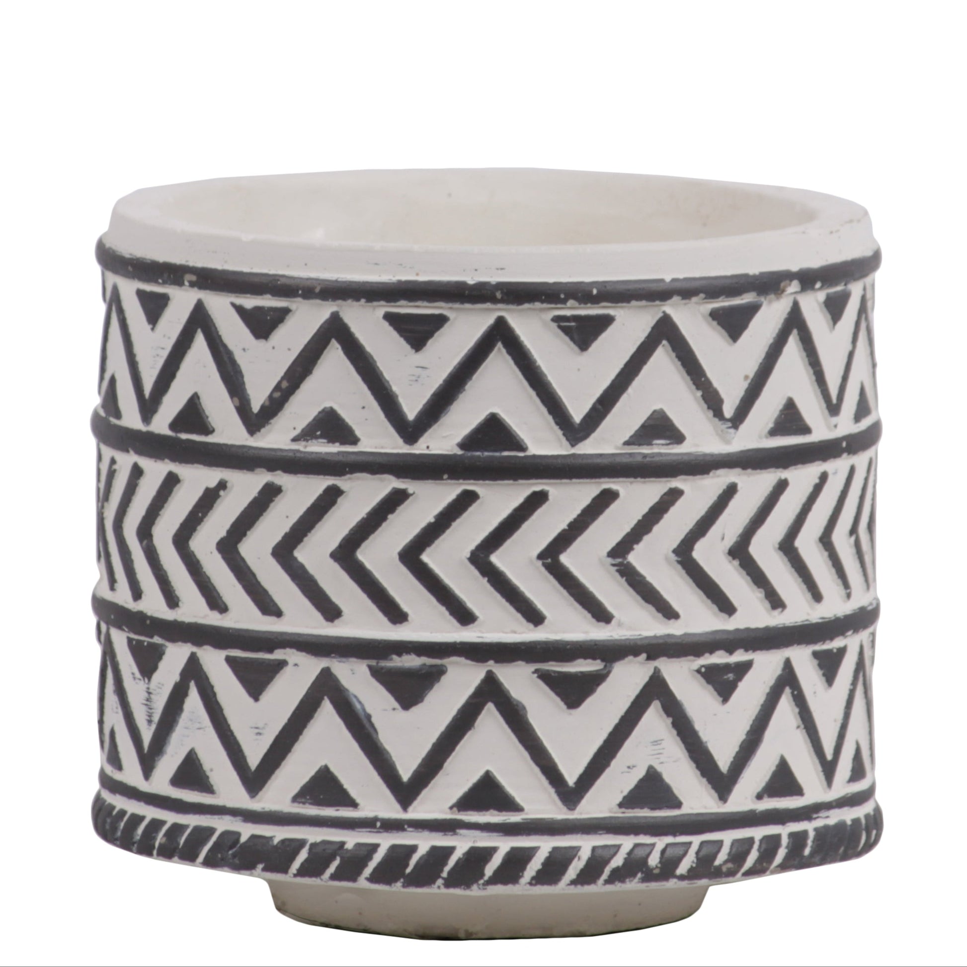 Ceramic Cylindrical Pot with Painted Black Embossed Lattice Chevron Design Body and Tapered Bottom SM Washed Finish White