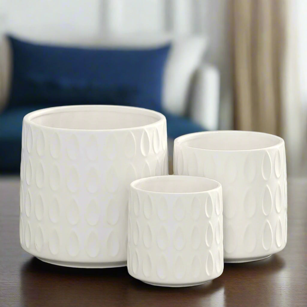 - Set of 3 ceramic vases with embossed banded pattern designs