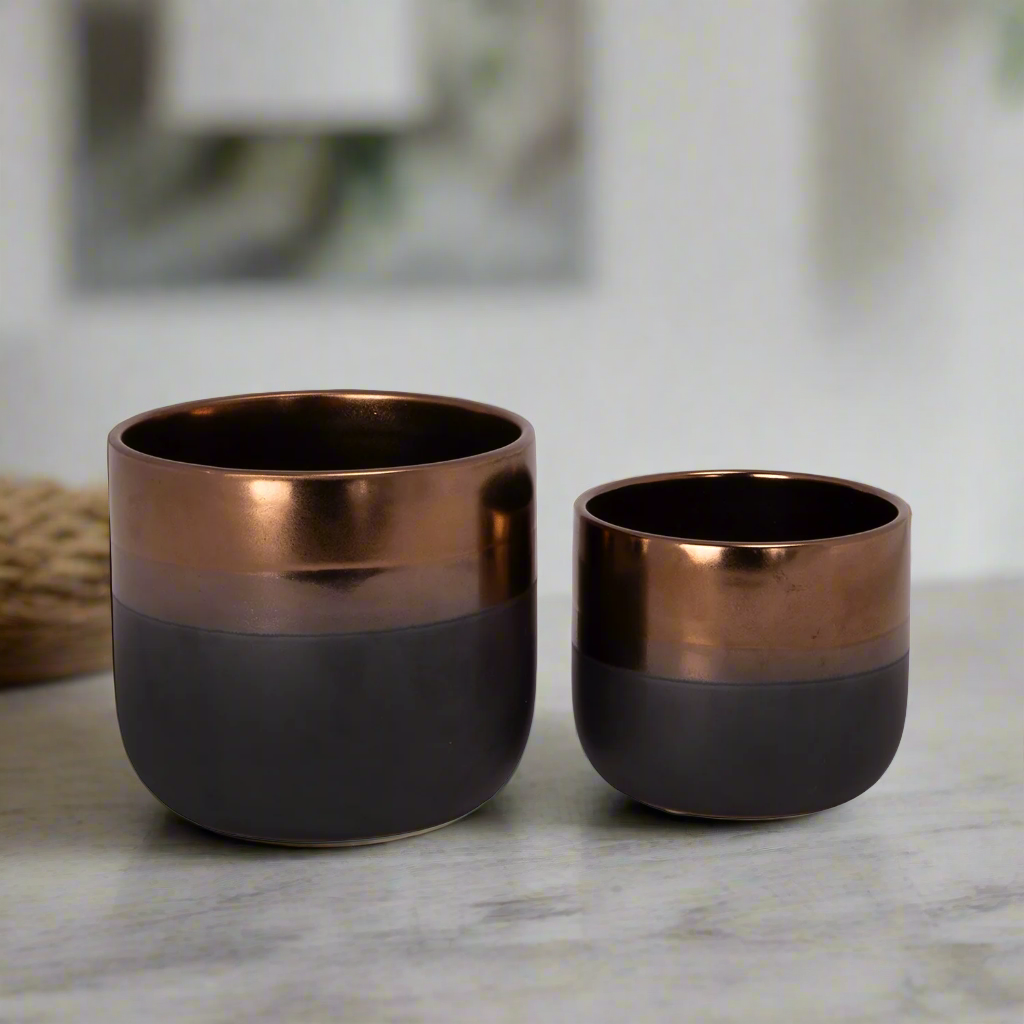 The Giordana Ceramic Round Banded Pot offers timeless elegance with a modern twist. Each pot features a gently rounded body with a tapered bottom, accented by a bold banded rim at the base. Available in two stylish finishes—Gloss Gold with Gray band or Gloss Gray with Black band—this set of two pots provides versatile options for showcasing plants, floral arrangements, or decorative accents.