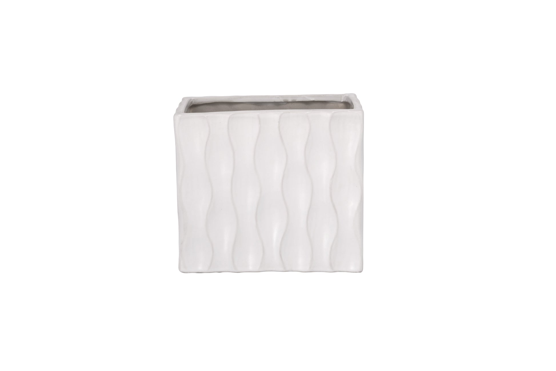 The Wynn Geometric Ceramic Vase features a sleek rectangular shape with a repeating geometric column wave pattern. This vase adds a modern sculptural element to any space. Perfect for minimalist floral arrangements or as a standalone decor piece.