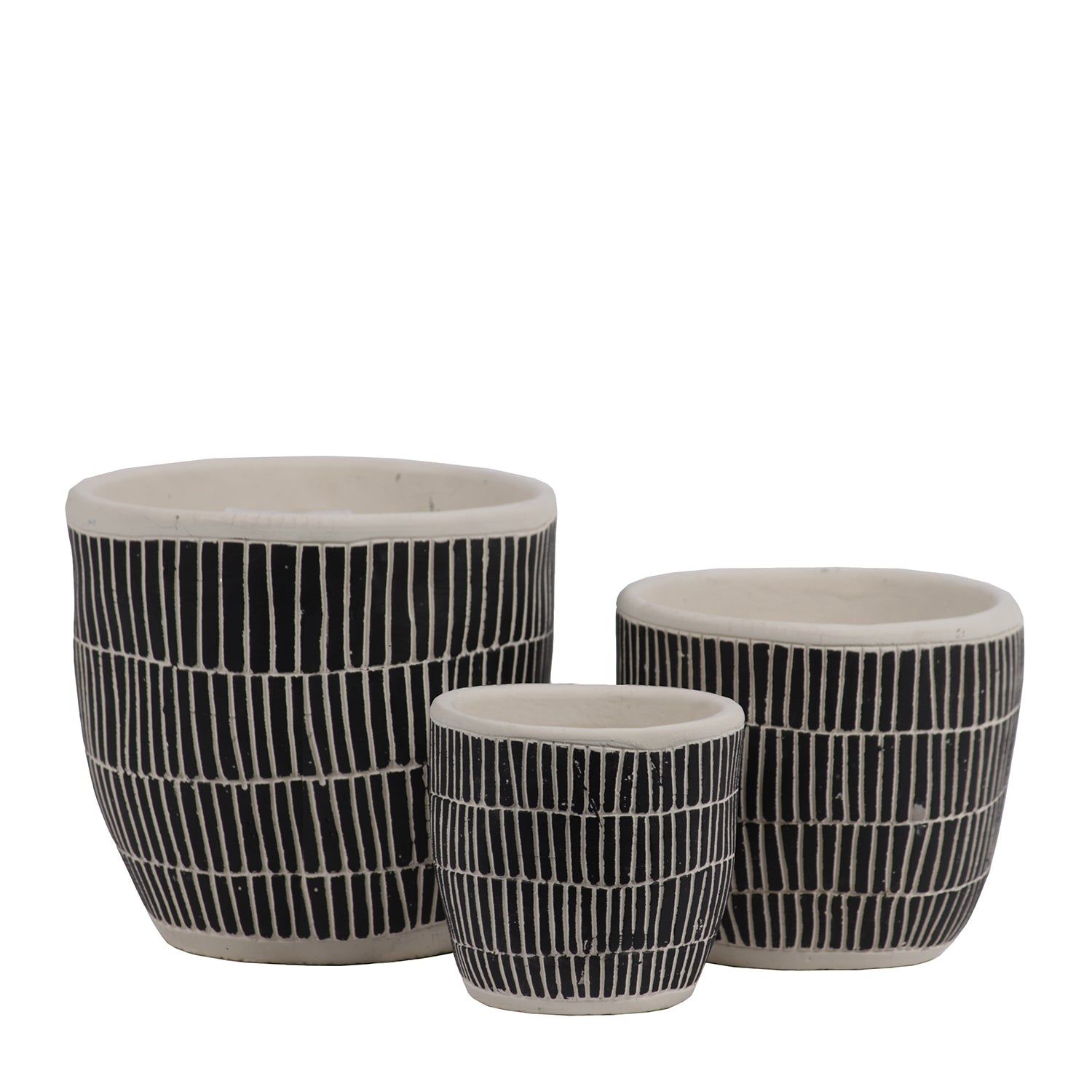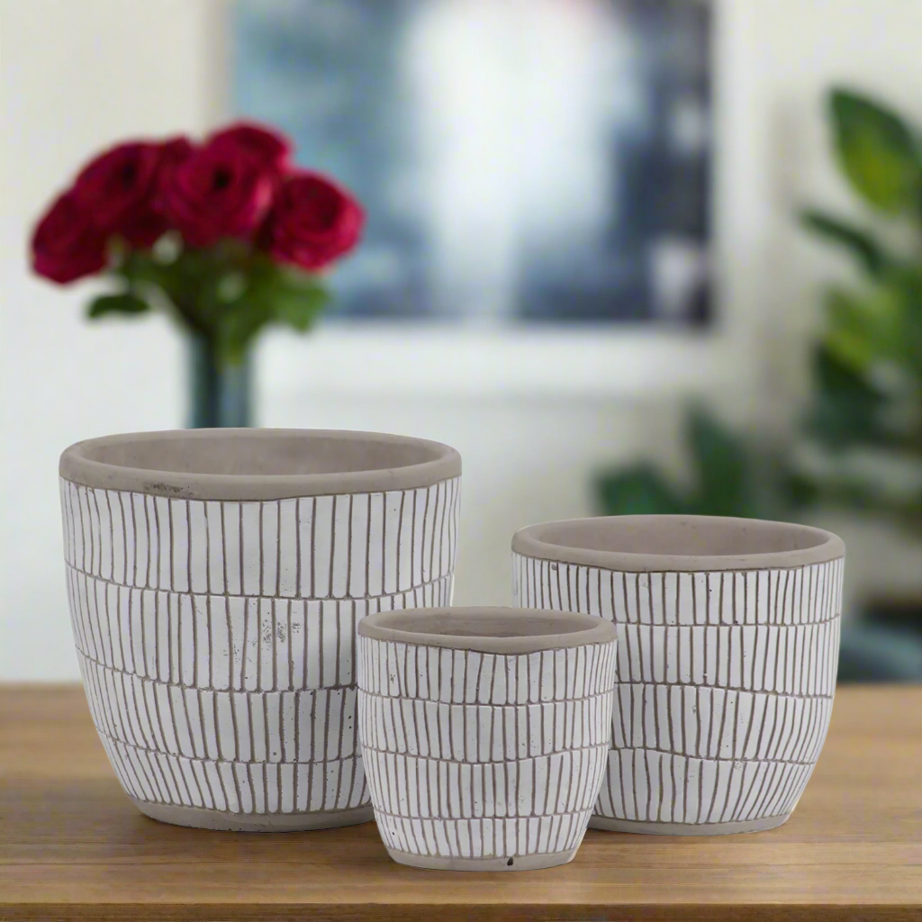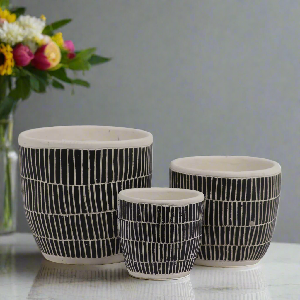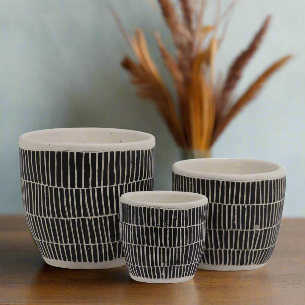 The Nalore Embossed Lattice Ceramic Pot Set blends textural character with an artisan-inspired form. Each round pot features a banded rim at the top and bottom, a softly irregular body shape, and an embossed rectangle lattice design for added depth. Finished in either painted black or white, this versatile set of three works beautifully for styling greenery or as standalone decorative accents.