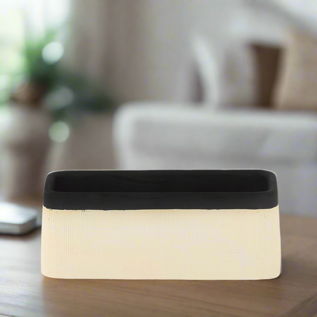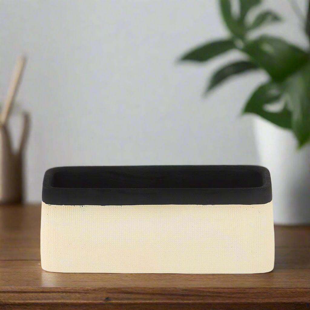 The Bravine Rectangular Cement Pot blends timeless style with durable craftsmanship, making it a versatile piece for both modern and classic settings. Featuring a smooth banded rim and an intricately embossed thin lattice design, it adds subtle texture and sophistication to any space. Built from sturdy cement, it’s perfect for displaying plants, succulents, or decorative arrangements indoors or in covered outdoor areas.