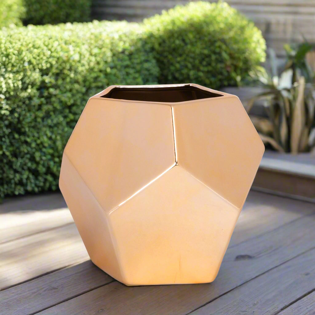 The Harper Hexagon Ceramic Planter features a bold geometric hexagon design with clean lines and a metallic gold finish. Crafted from ceramic, this planter adds a touch of modern elegance and warmth to any space. Available in two sizes, it’s perfect for displaying your favorite plants or as a standalone decorative piece.