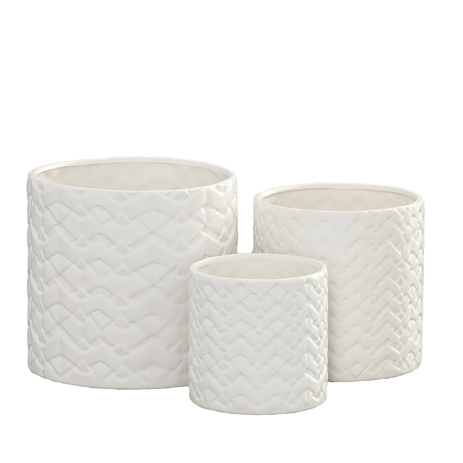 Looking for planters that blend subtle texture with timeless design? The Alene Ceramic Round Planter Set showcases an elegant chevron weave overlay pattern and smooth matte finish, bringing depth and sophistication to any space. Perfect for displaying lush greenery, florals, or succulents, these planters offer versatile styling for homes, offices, patios, or event décor.