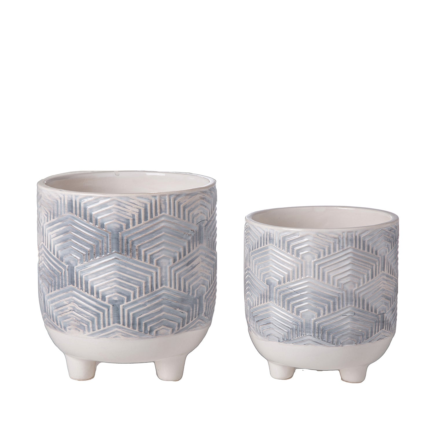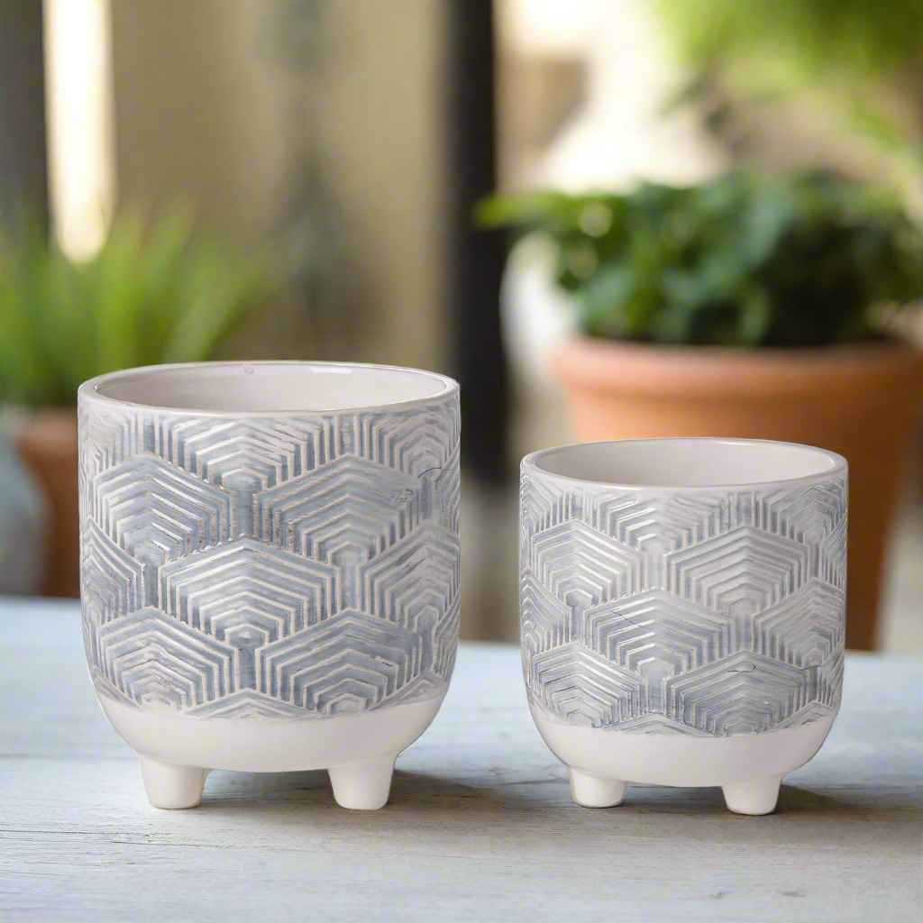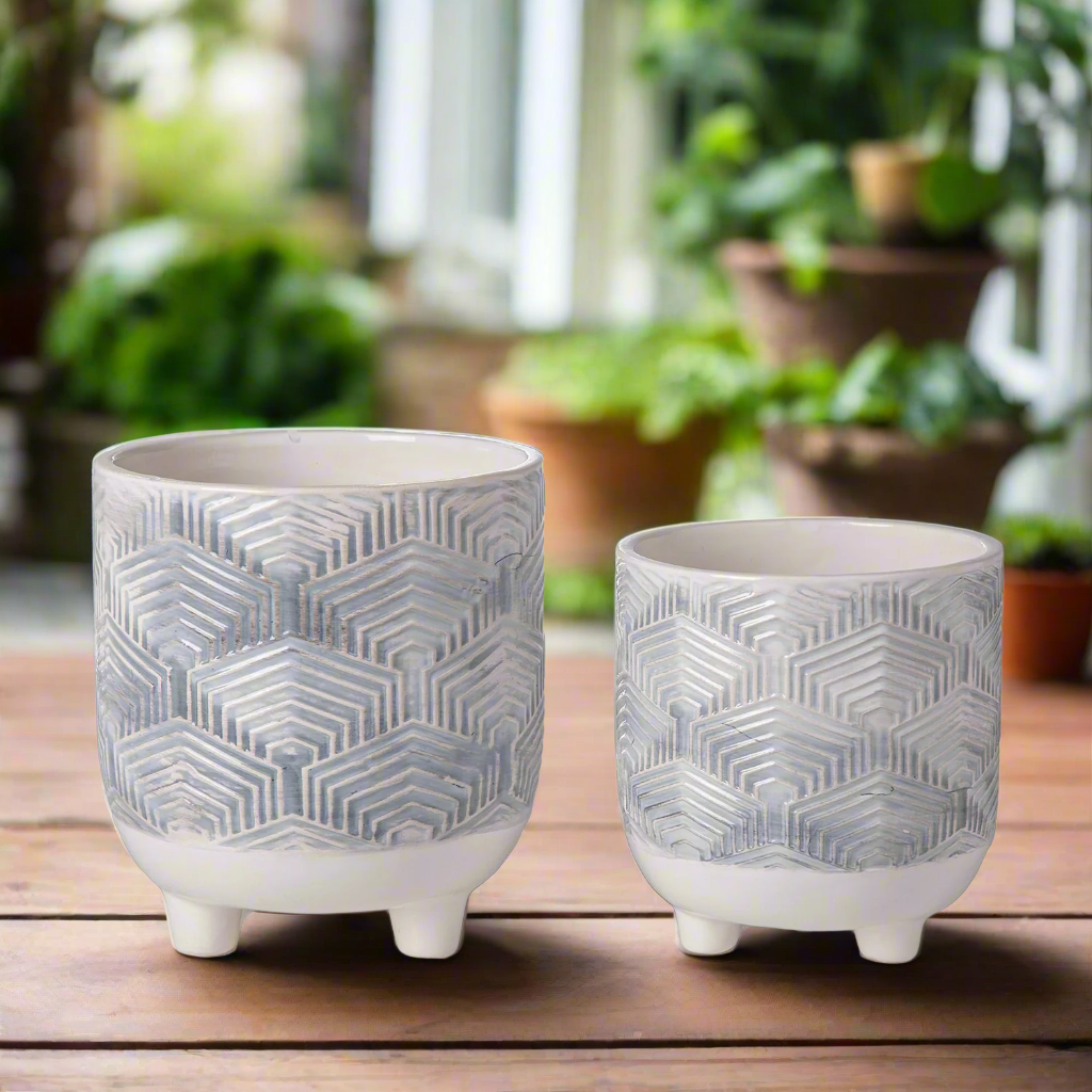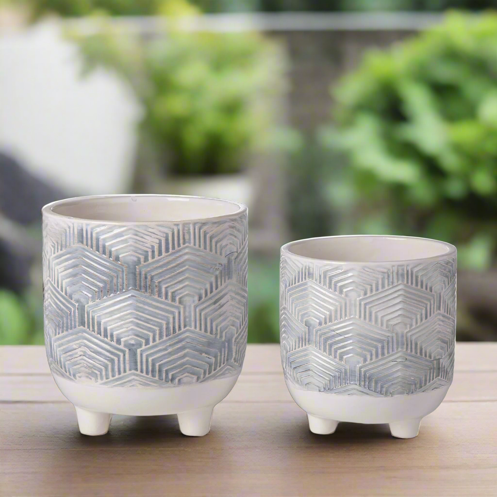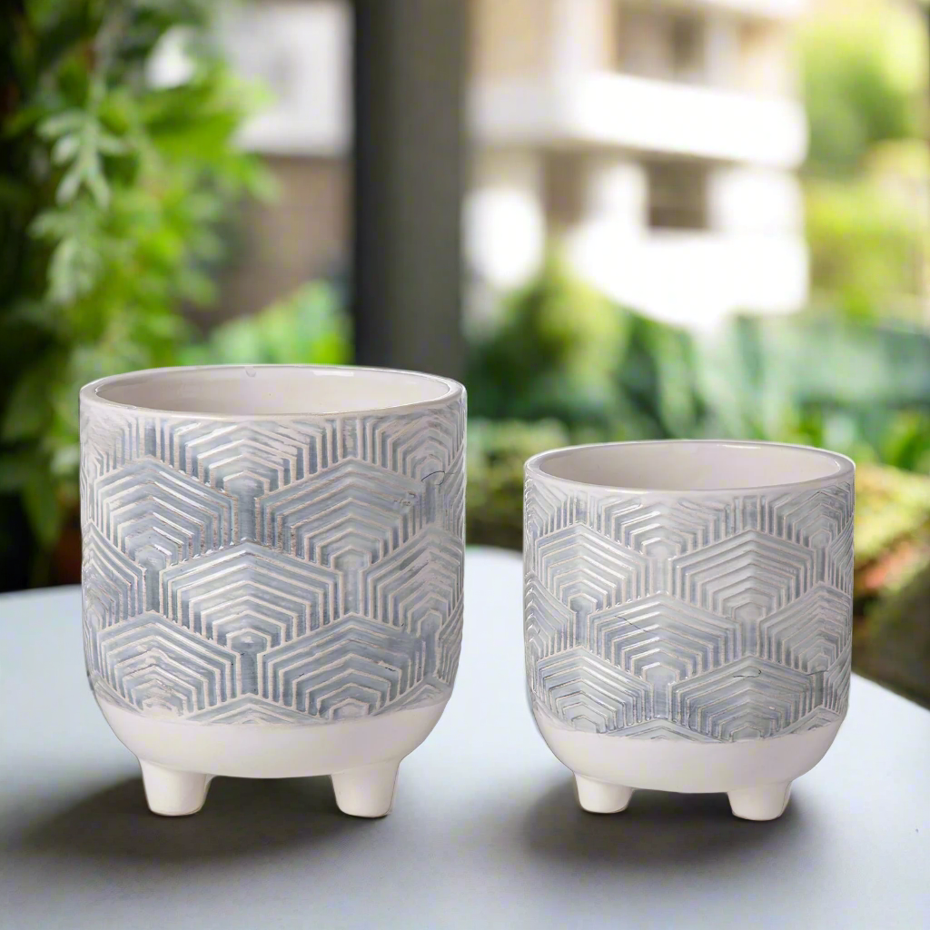 The Arvian Baby Blue Tripod Planter Set (Set of 2) combines artistic design with functional elegance. Each round ceramic pot showcases an embossed arch abstract pattern, enhanced by a glossy baby blue finish that adds a refreshing pop of color. Supported by sleek tripod stands, these planters bring height and dimension to your plant displays, making them perfect for shelves, tabletops, or cozy corners.