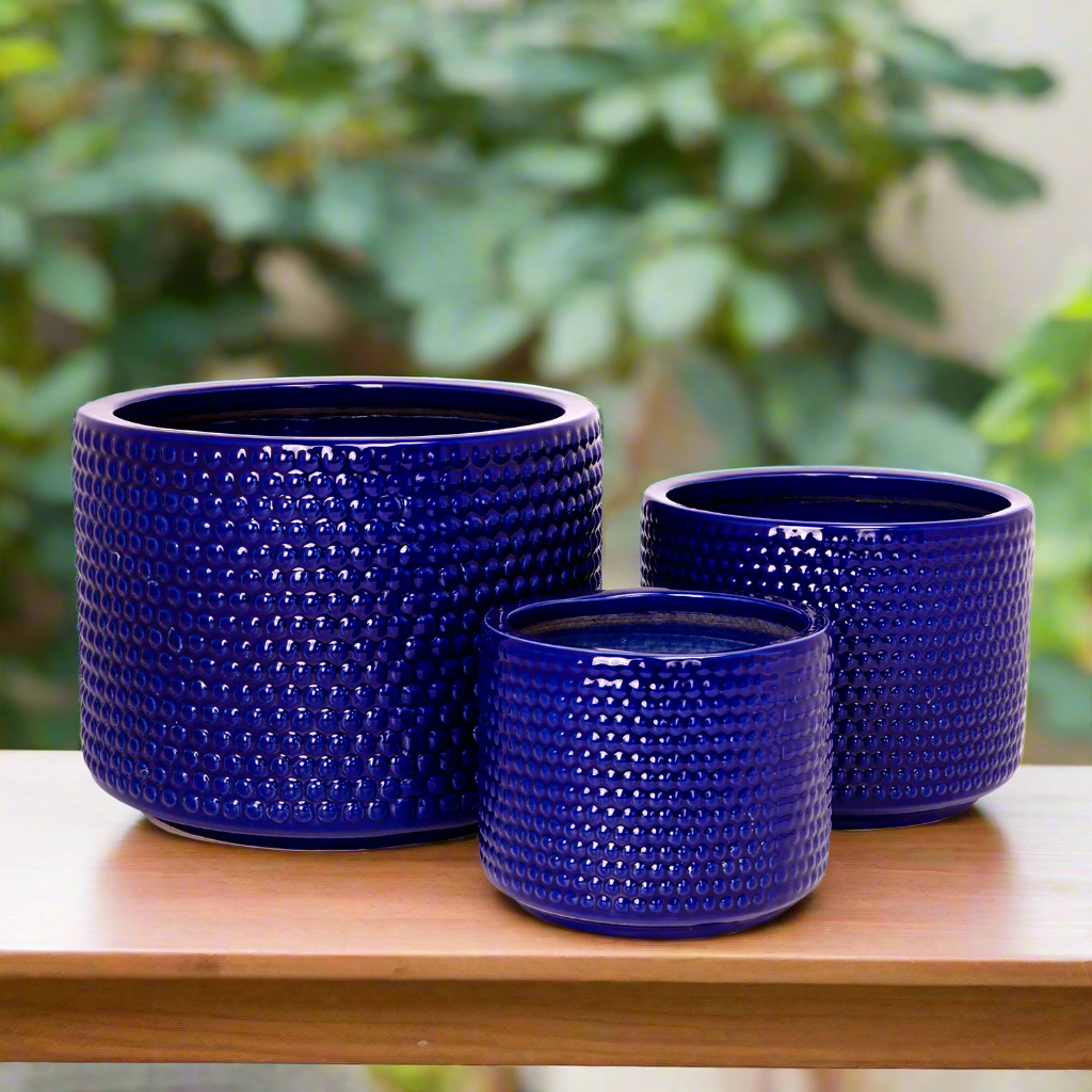 The Beyora Blue Ceramic Planter Set (Set of 3) brings vibrant color and timeless style to any plant display. With a rich blue finish and classic rounded design, these planters serve as a bold accent while harmonizing beautifully with greenery.
