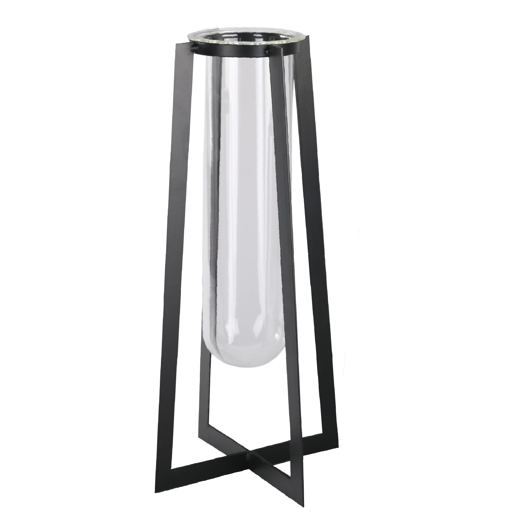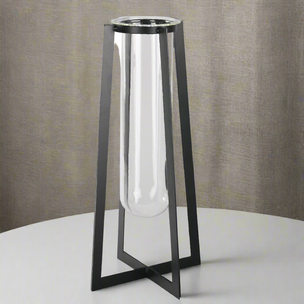 Minimalist in form with a unique display feature, the Corven Hanging Tube Vase Stand combines structured metal design with delicate glass. The square metal frame supports a suspended clear tube vase, perfect for showcasing a single stem, dried floral, or propagation cutting. Its open structure and flared bottom offer stability while adding sculptural appeal to desktops, shelves, or entryway tables.