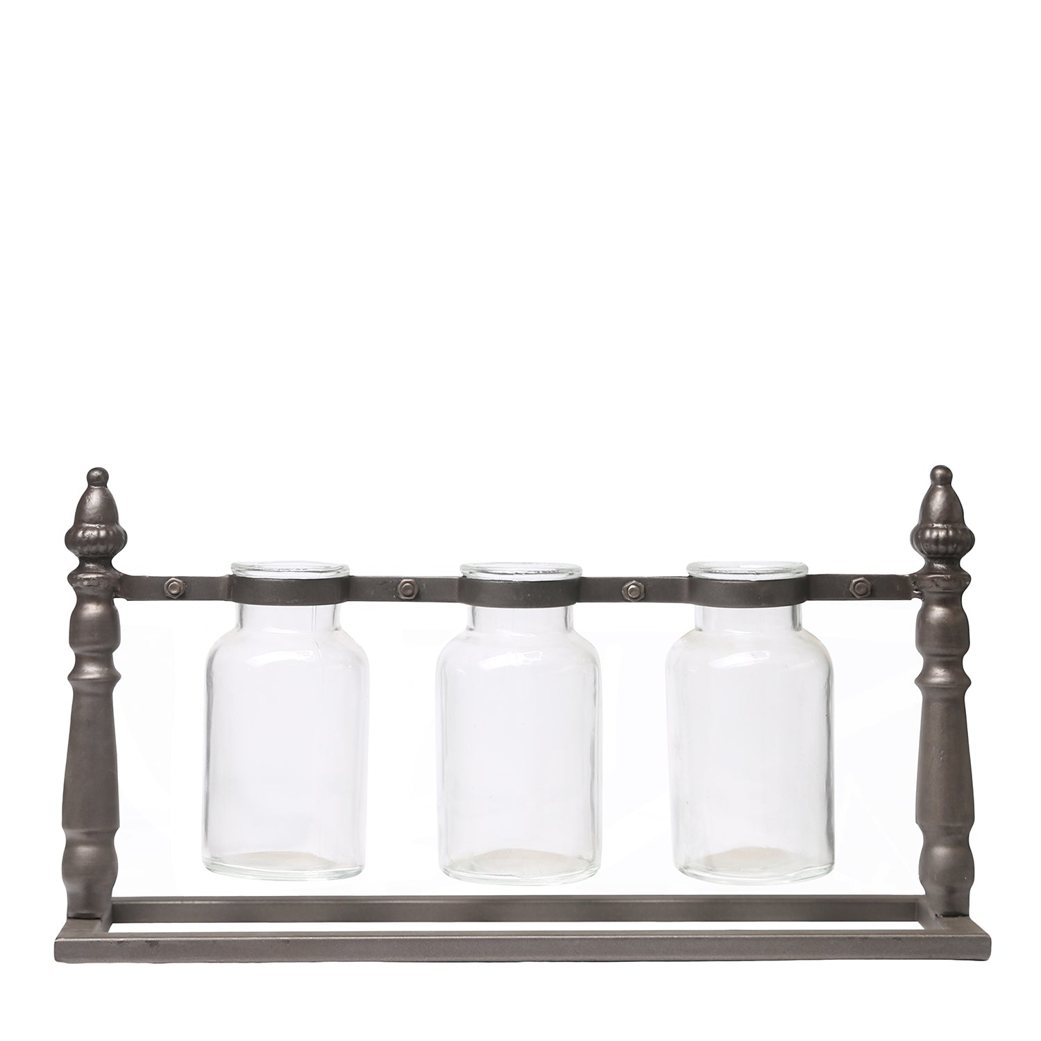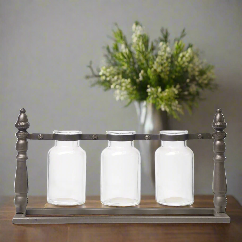 - Includes multiple short hanging glass bottle vases