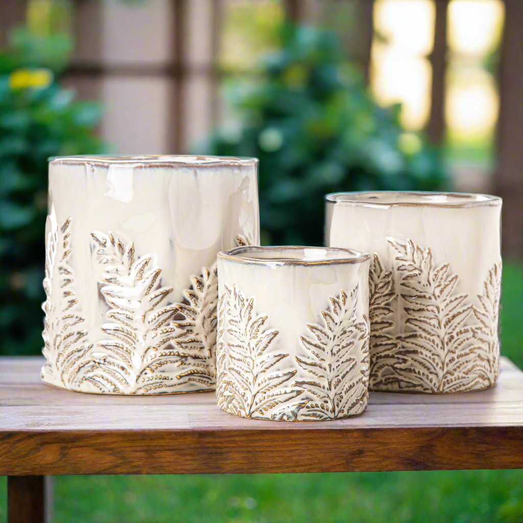 The Floris Distressed Ivory Planter Set (Set of 3) brings a touch of natural artistry to your décor. Each ceramic round pot features an embossed waving plants design, adding organic movement and texture that beautifully complements greenery. The distressed ivory finish enhances its timeless appeal, making it an elegant yet versatile choice for modern, rustic, or traditional interiors. Perfect for housing succulents, herbs, or decorative florals, this trio creates a cohesive display whether grouped together or styled individually.