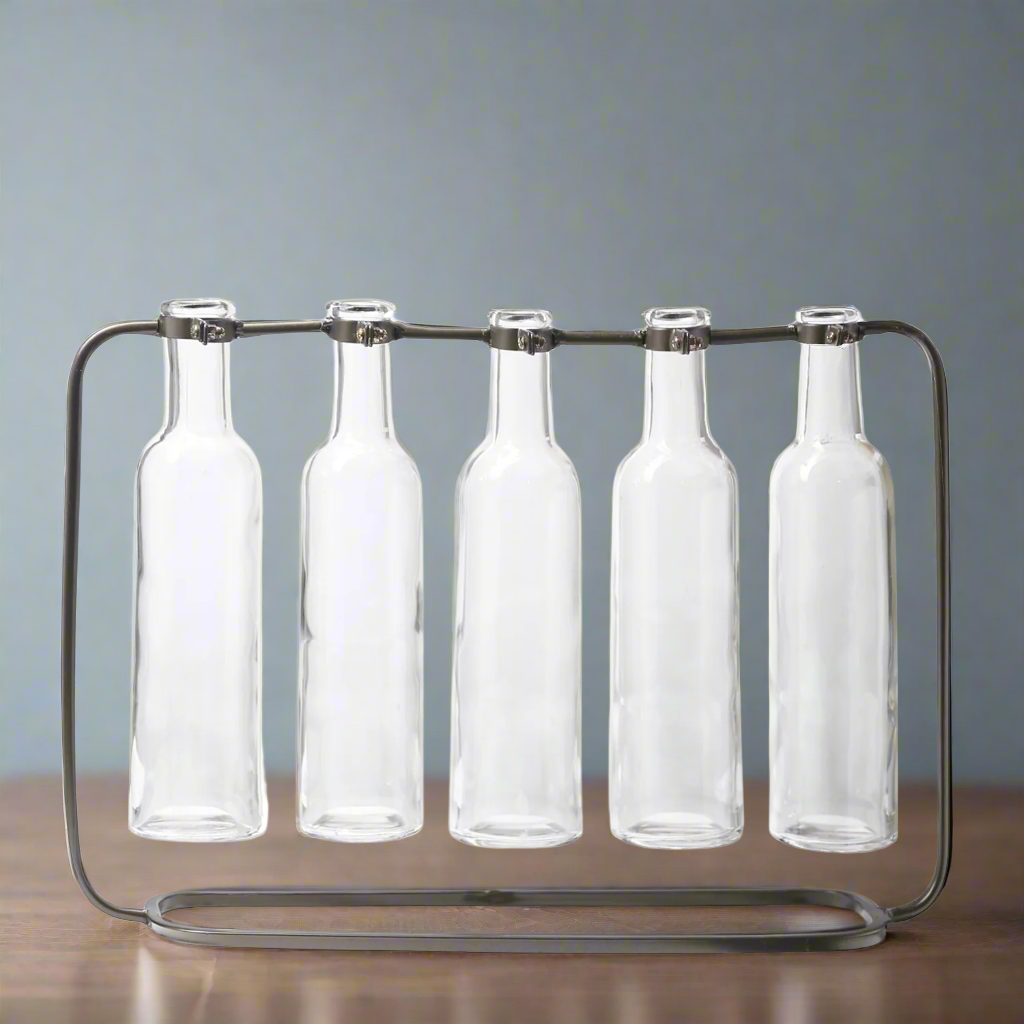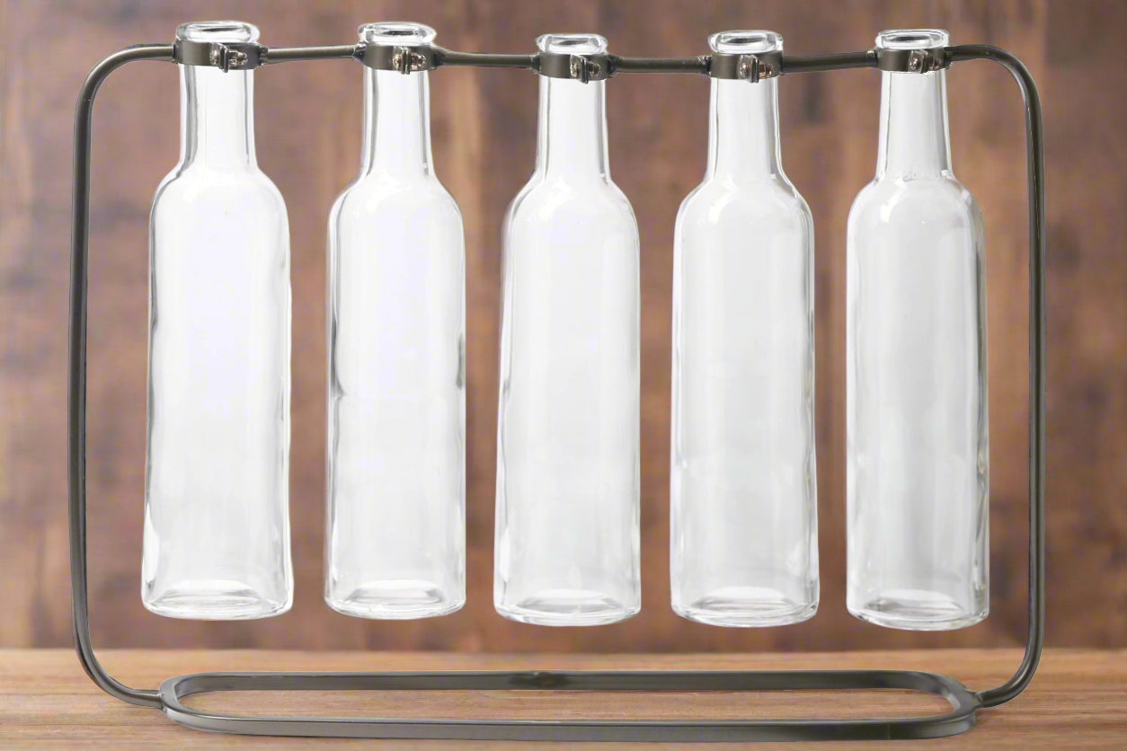- Includes 5 tall clear glass bottle vases