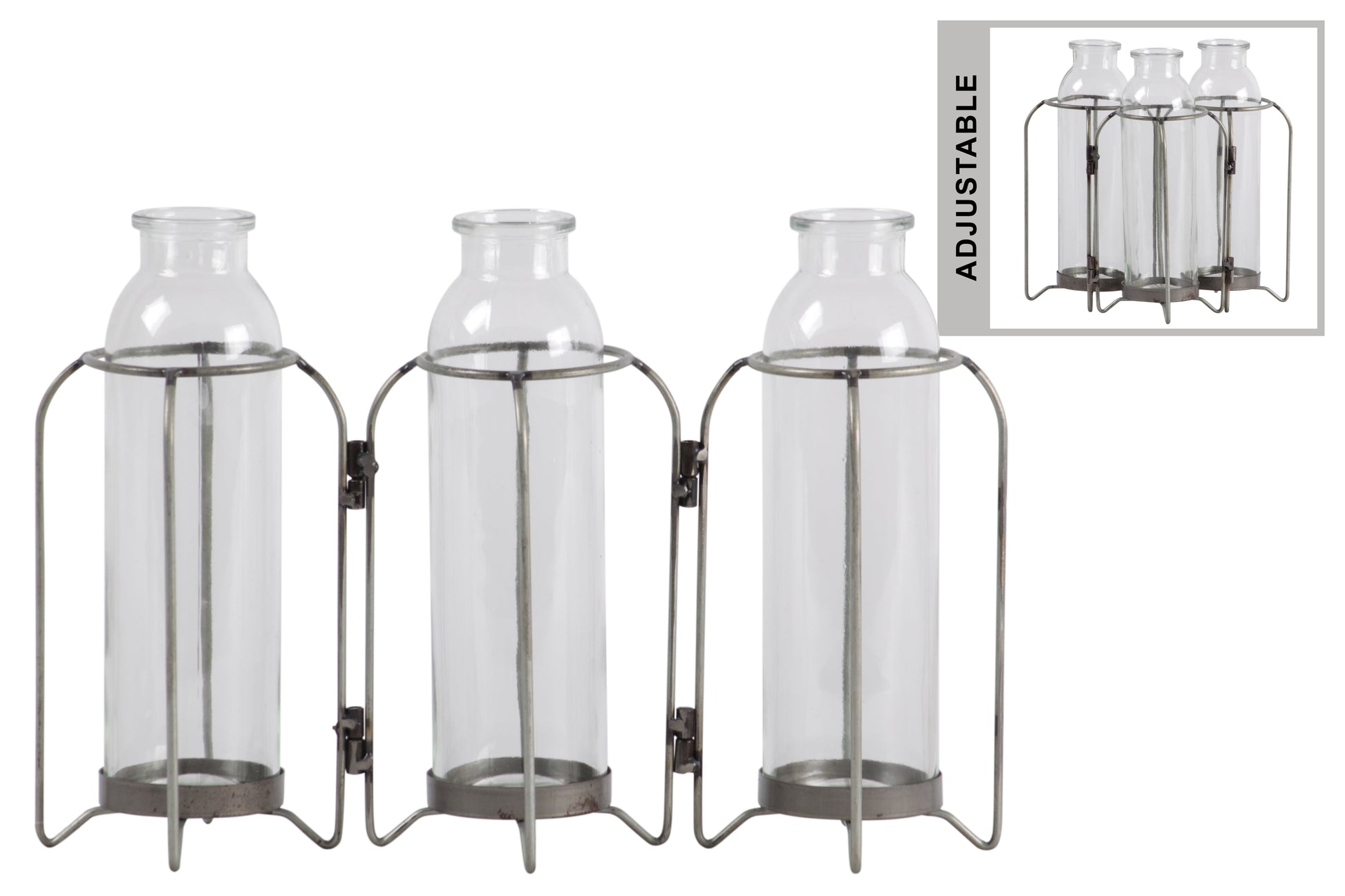 Metal Hinged Bud Vase Holder with 3 Glass Bottle Vases Distressed Finish Silver