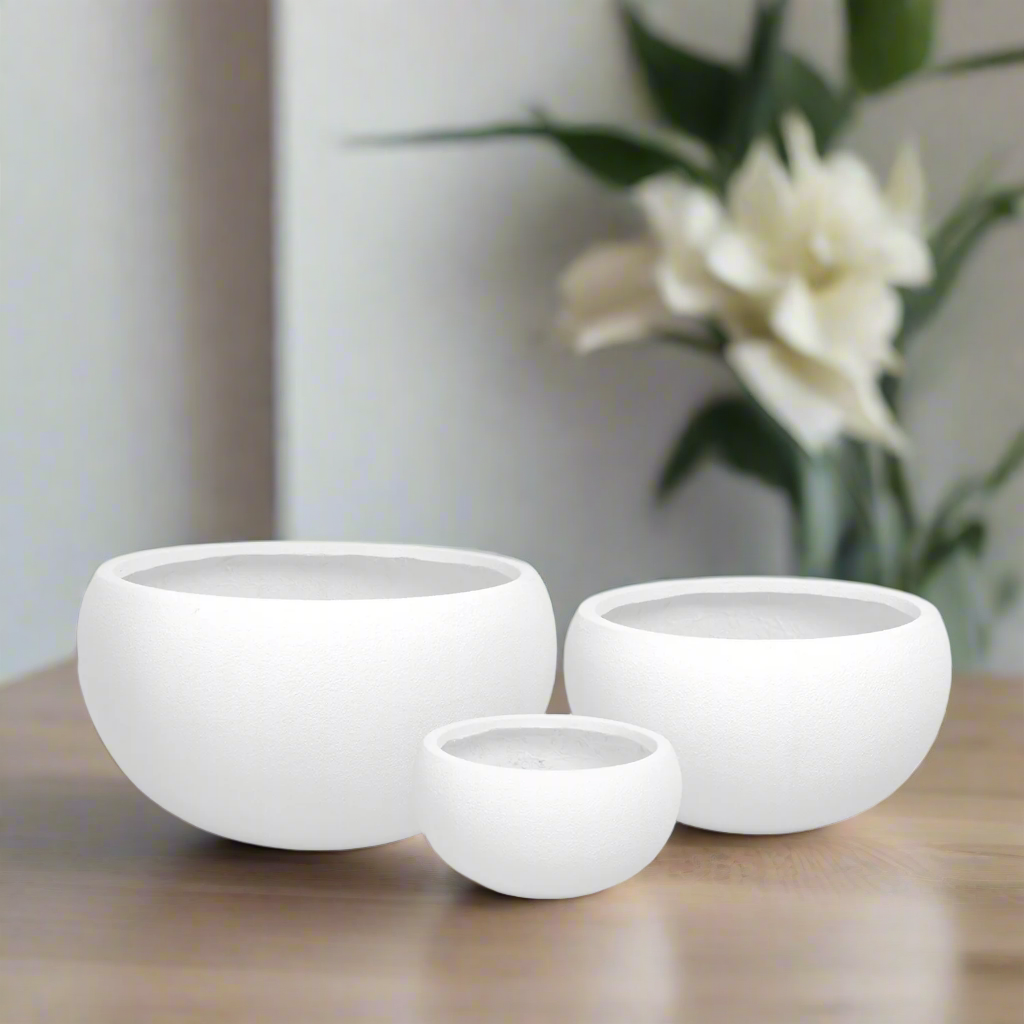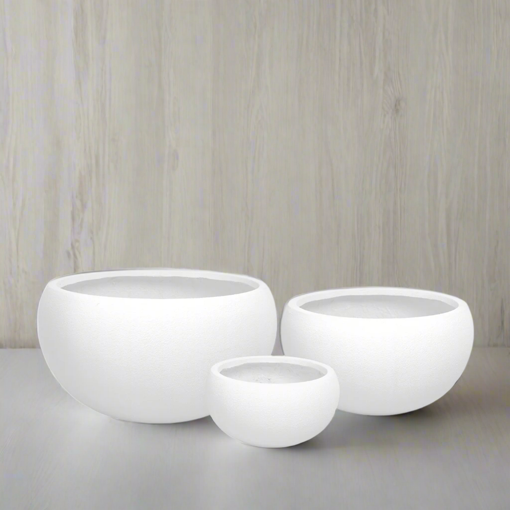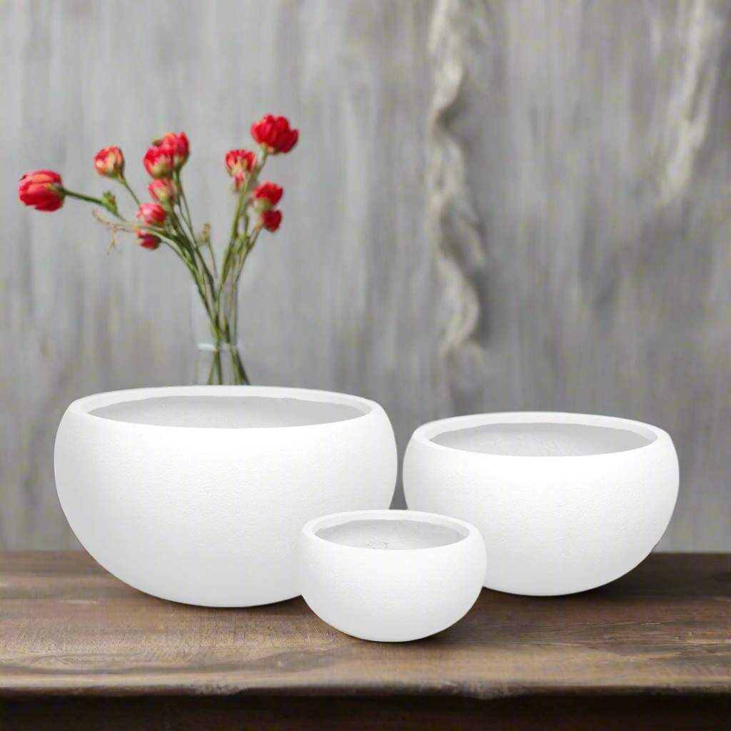 - Set of three shallow fiberclay planters in Large, Medium, and Small sizes