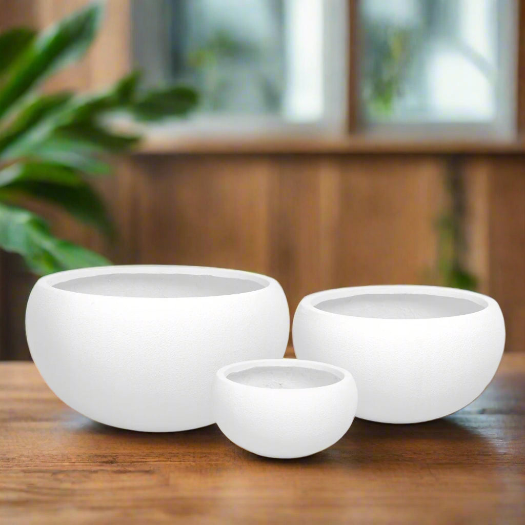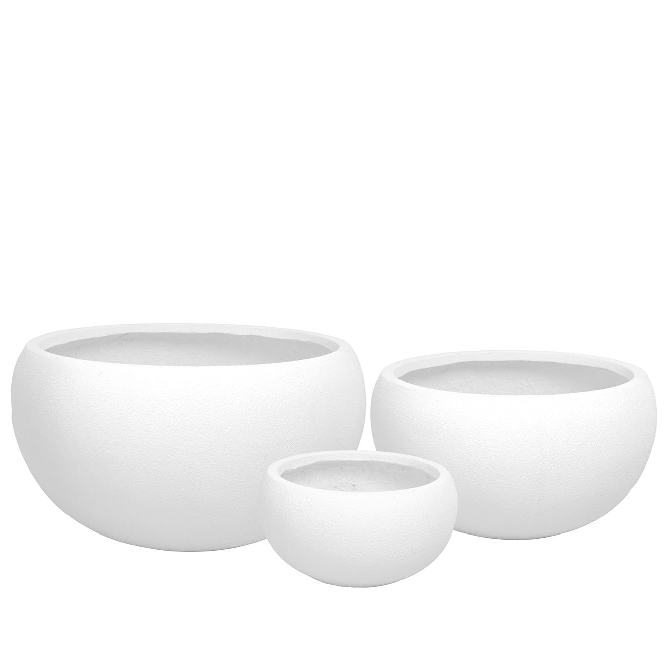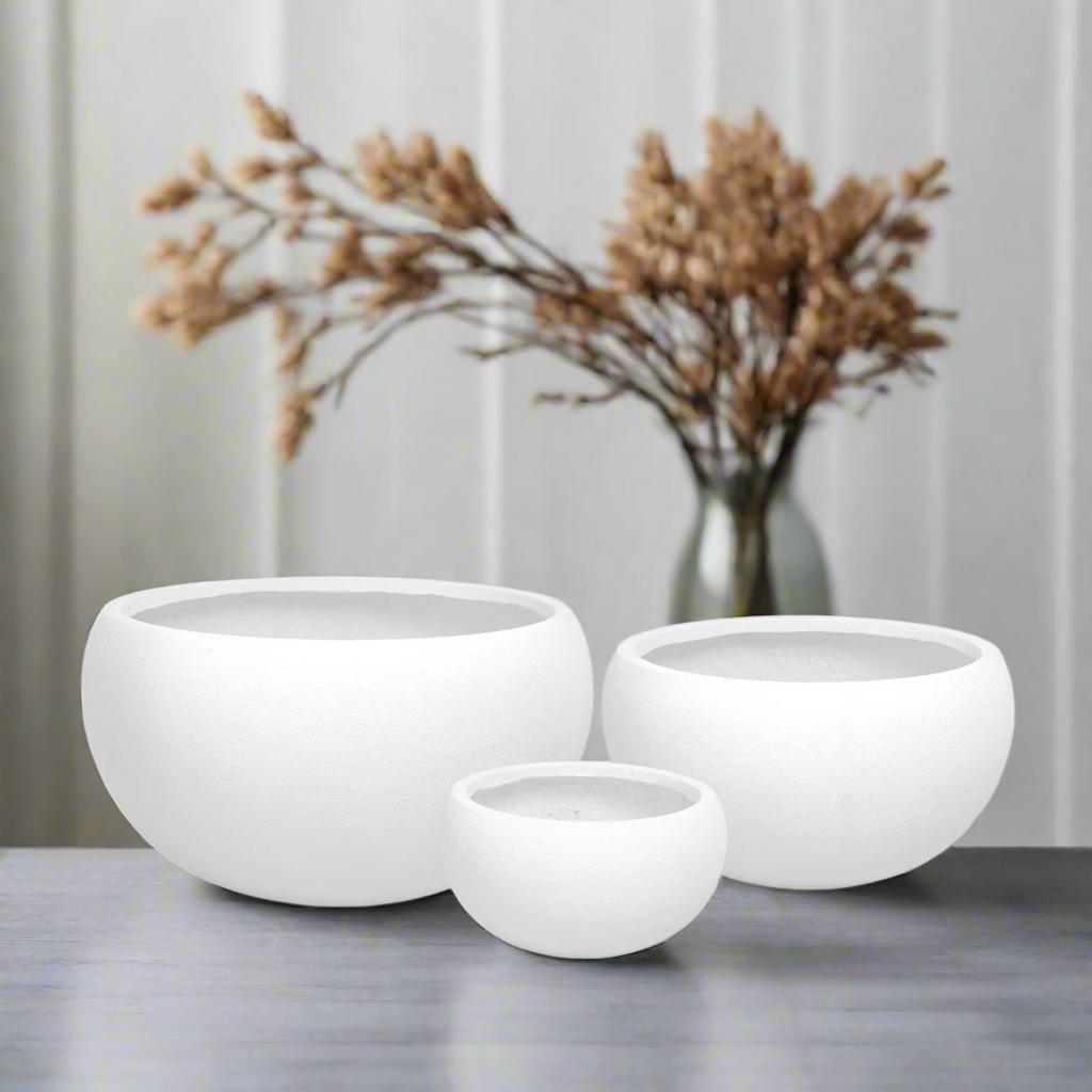- Set of three shallow fiberclay planters in Large, Medium, and Small sizes