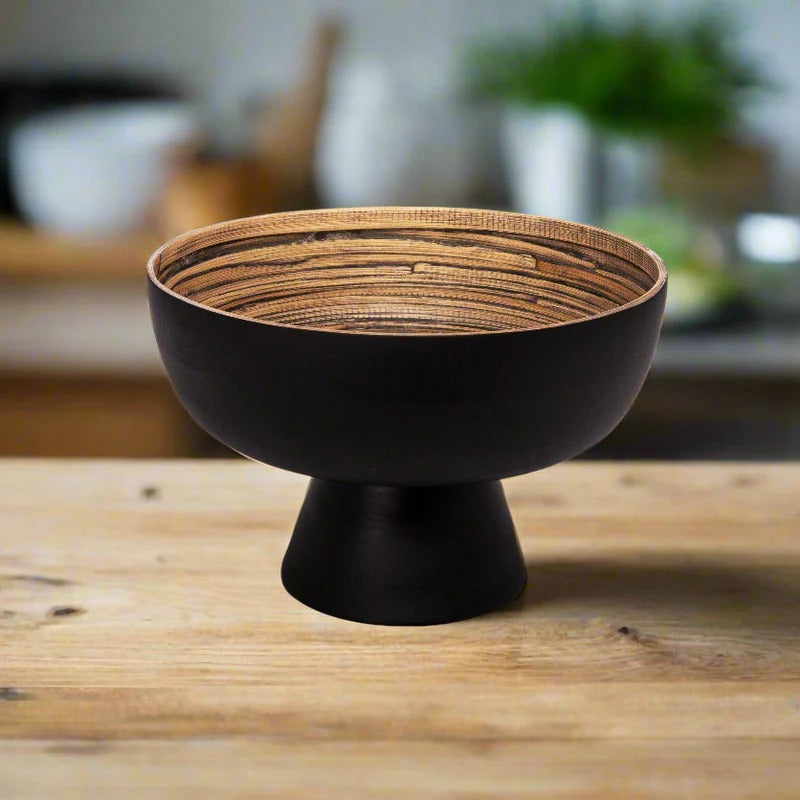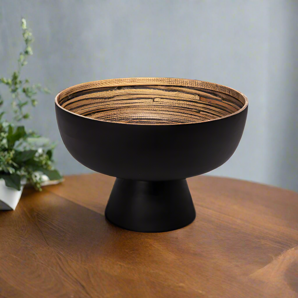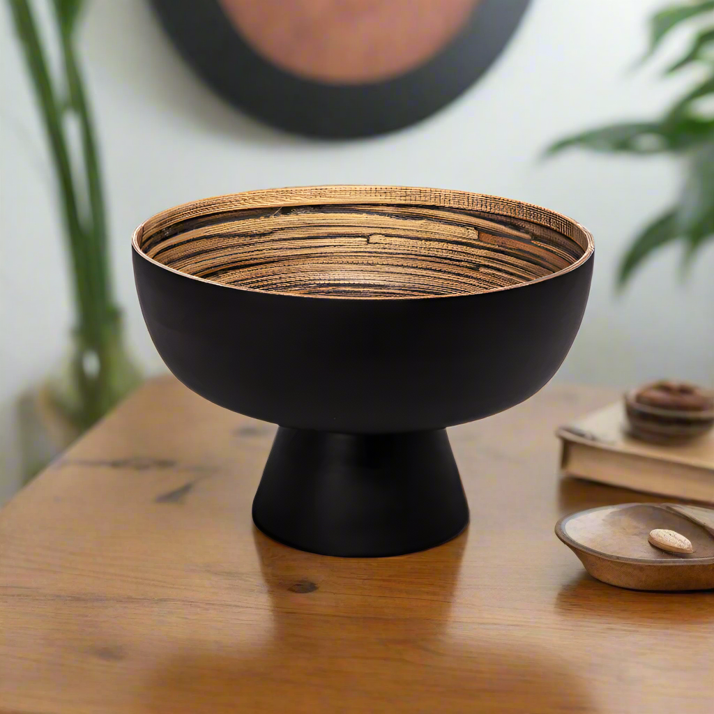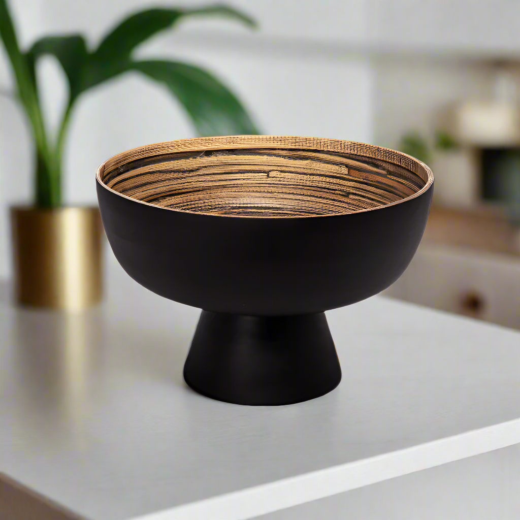 Looking for a sleek accent with natural texture? The Nova Lacquer Bamboo Bowl with Base blends organic material with a matte black finish for a refined, modern look. Its wide, rounded shape and sturdy base make it a striking piece for tabletops, counters, or entryways.